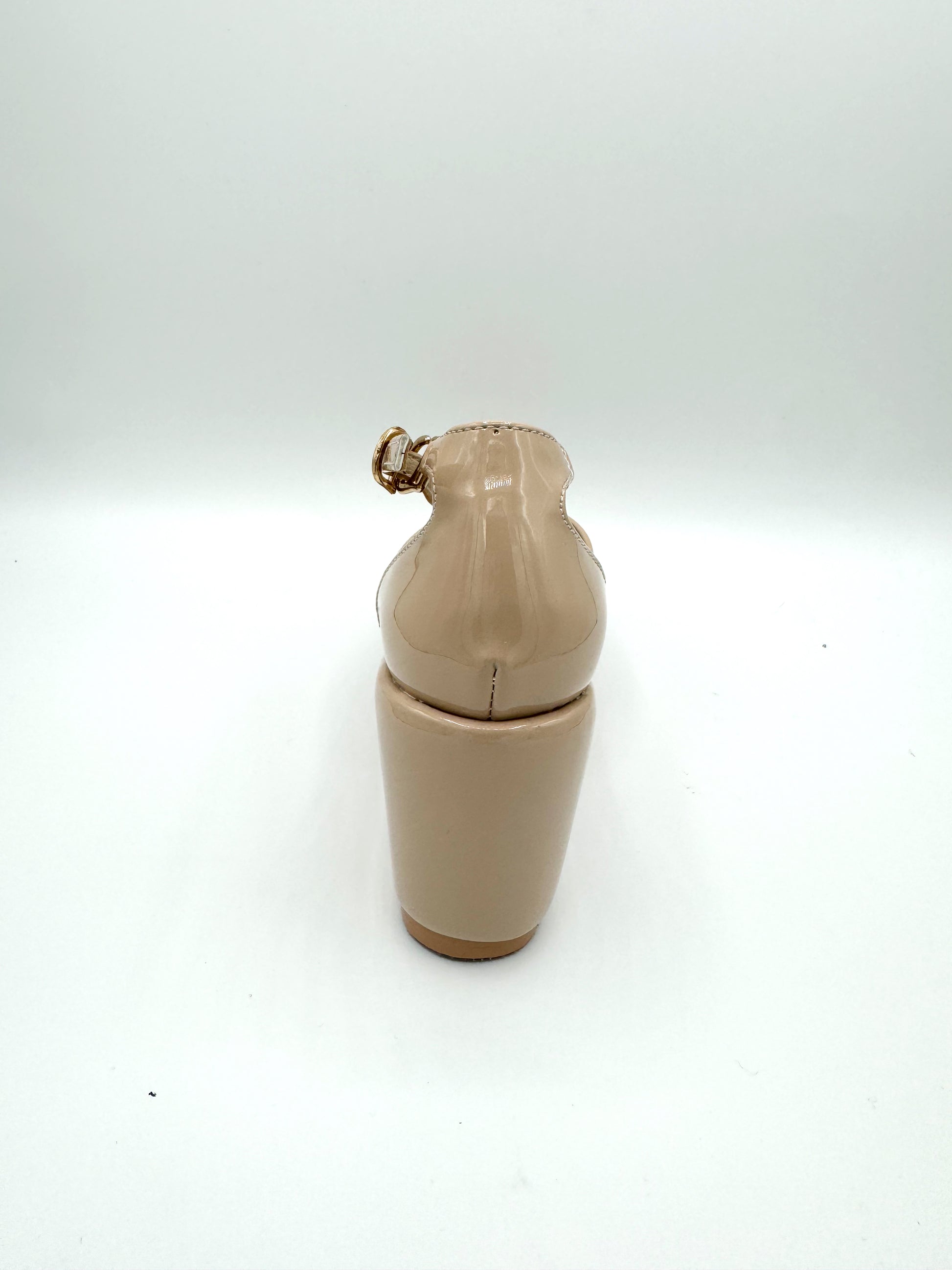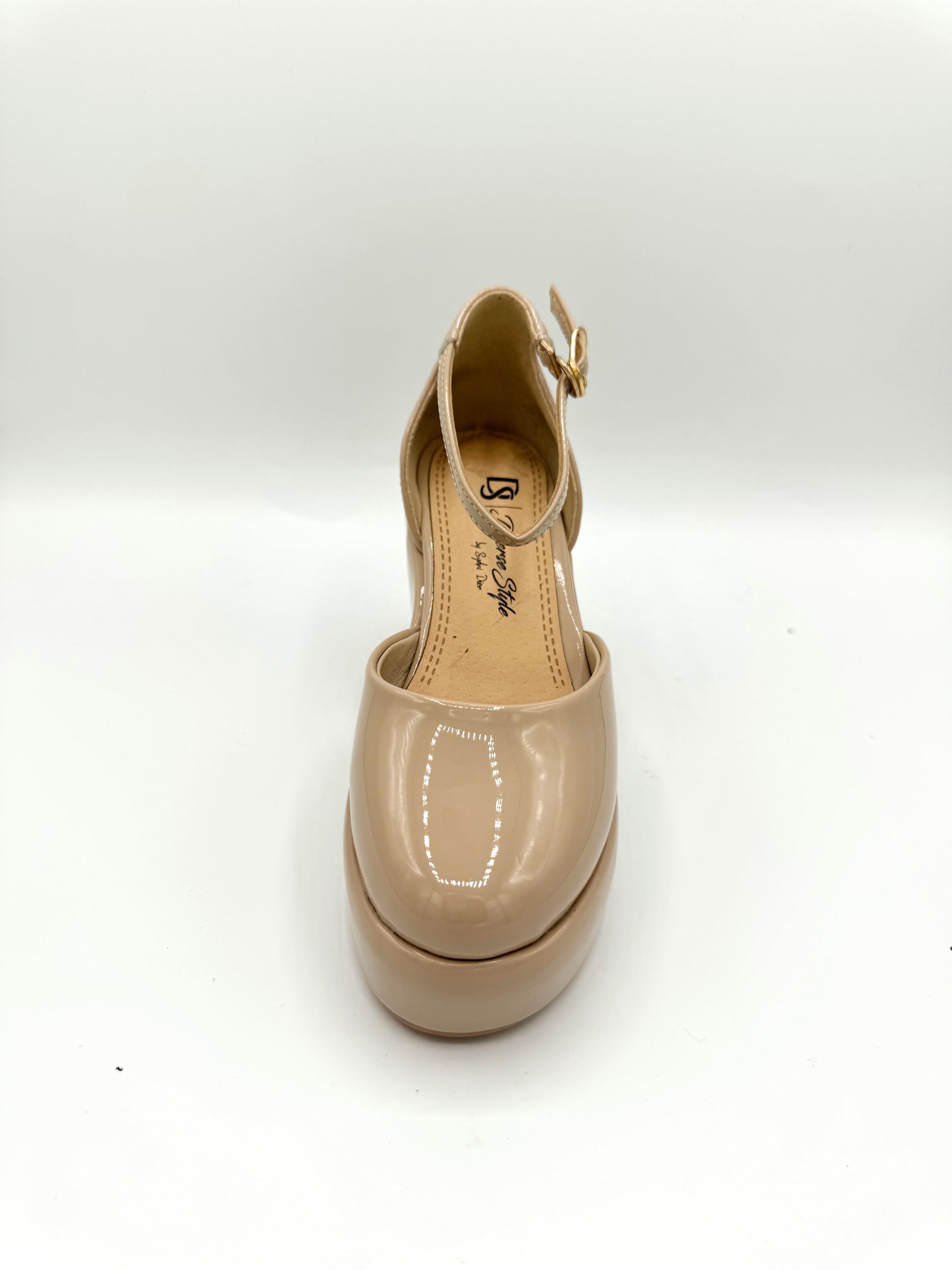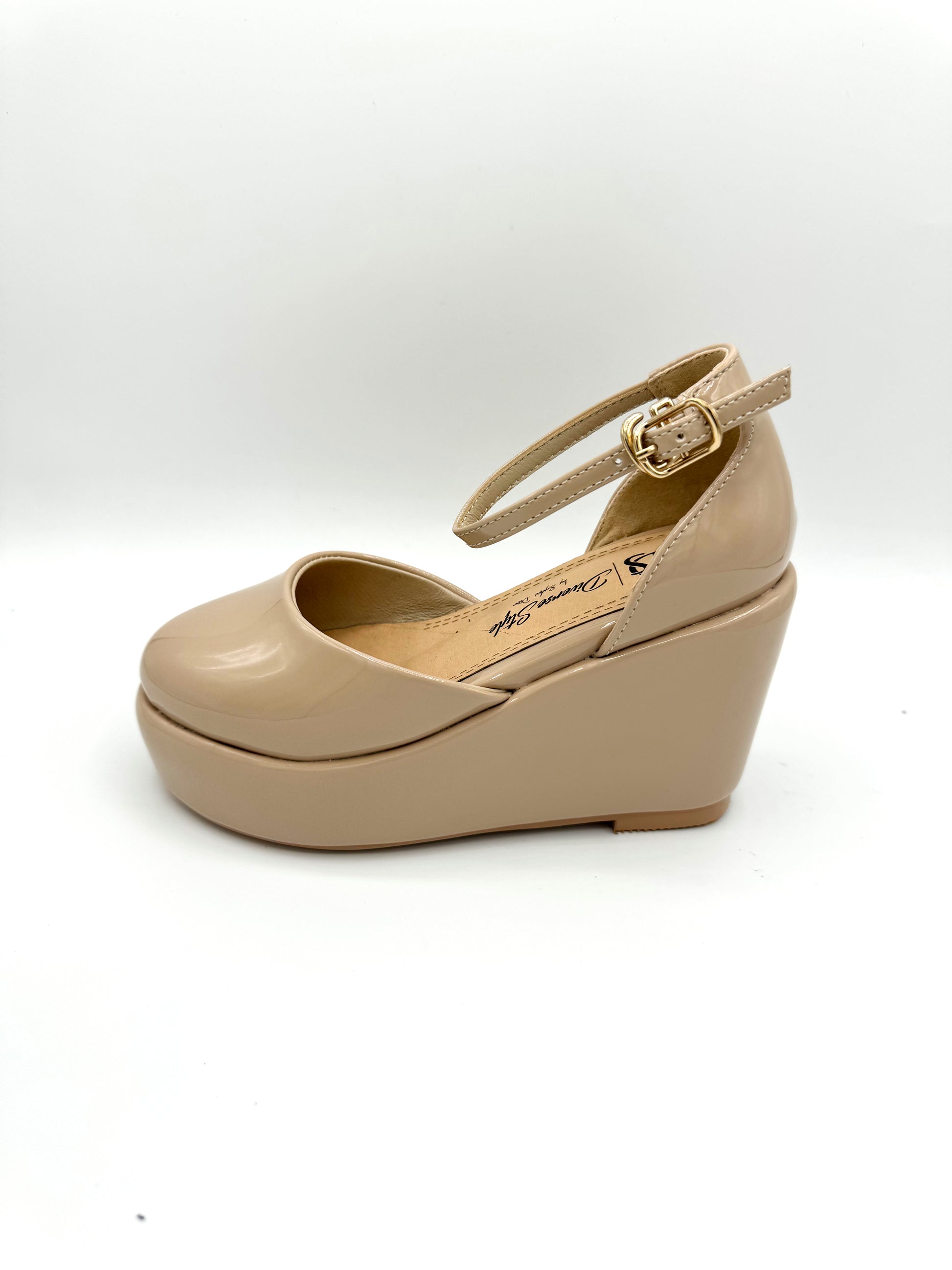 A sleek nude patent wedge with a rounded toe, ankle strap, and platform sole. Stylish yet comfortable, it’s the perfect blend of height and ease.