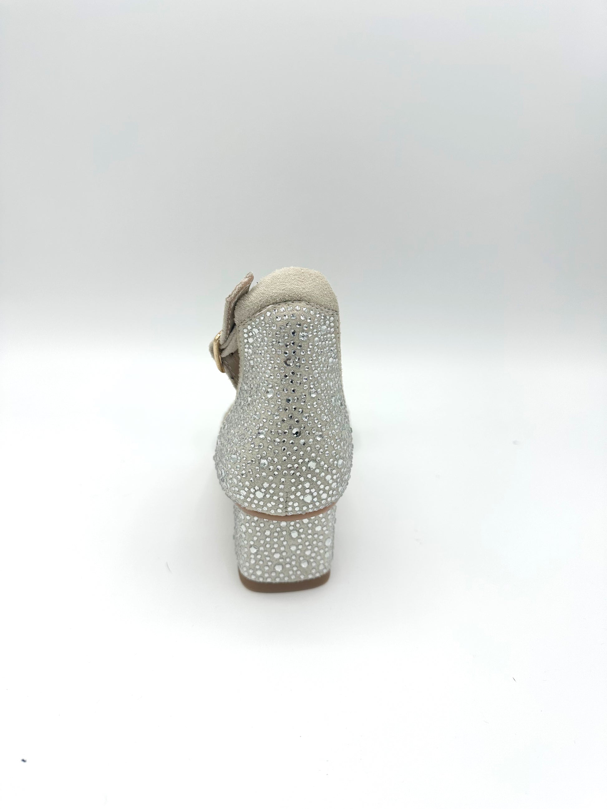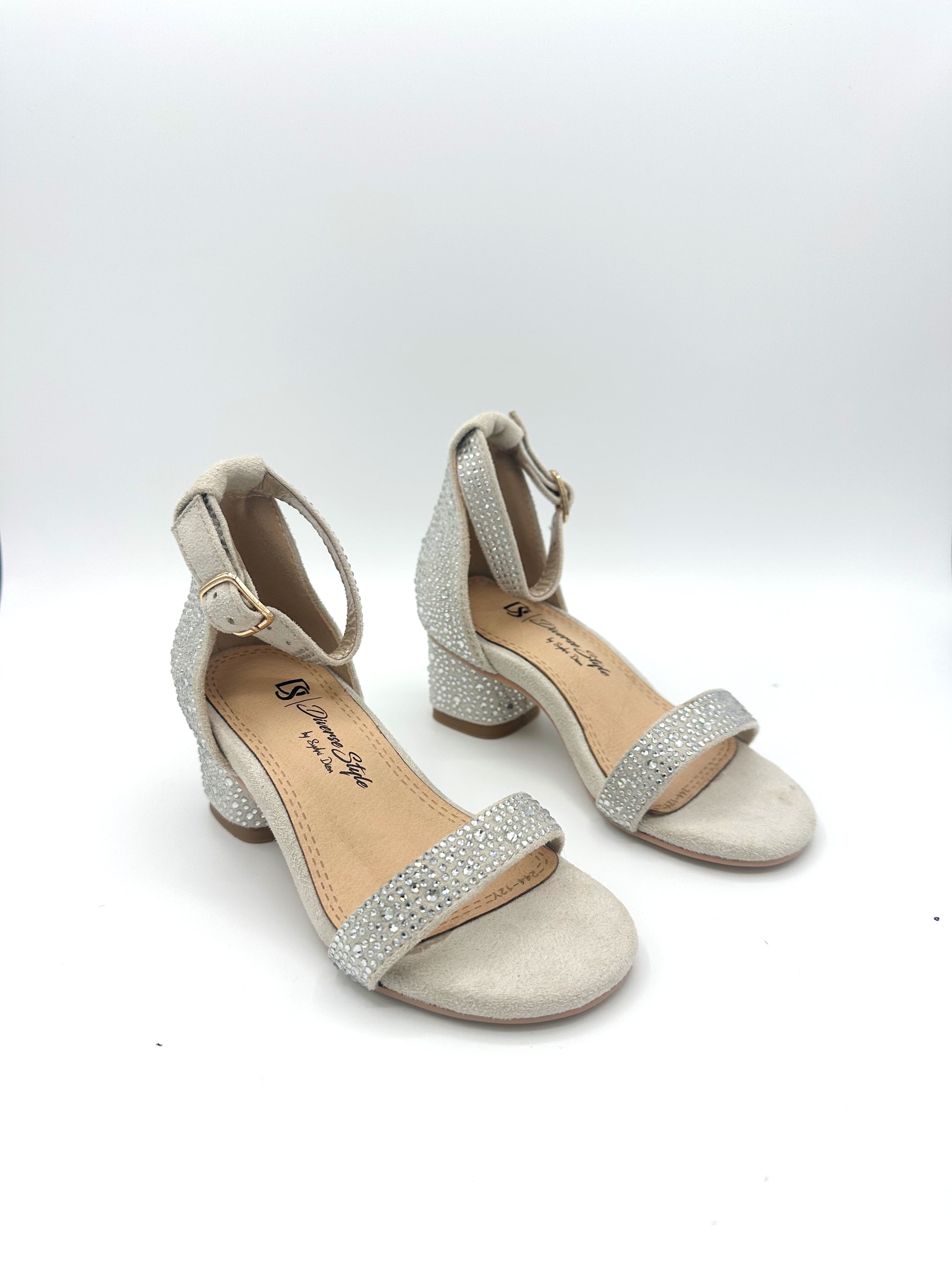 NUDE IS MORE THAN ONE COLOR - Genuine suede sole (white), clear rhinestones, gold buckle, 2 inch heel - extra cushion for comfort - True to size