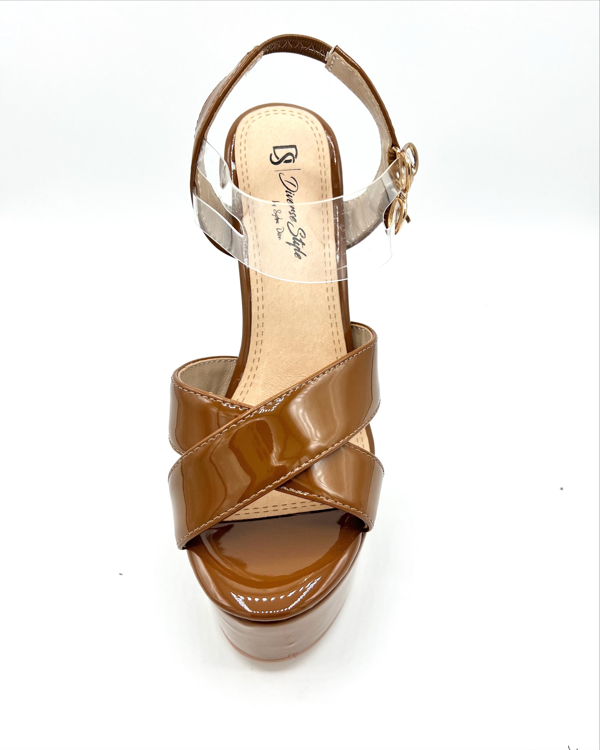 NUDE IS MORE THAN ONE COLOR - brown genuine patent leather, matches light to medium brown skin tones, shoe will elongate leg and give extra height, lucite ankle strap, 6 1/2 inch heel, extra cushion for comfort to endure hours of standing -True to size