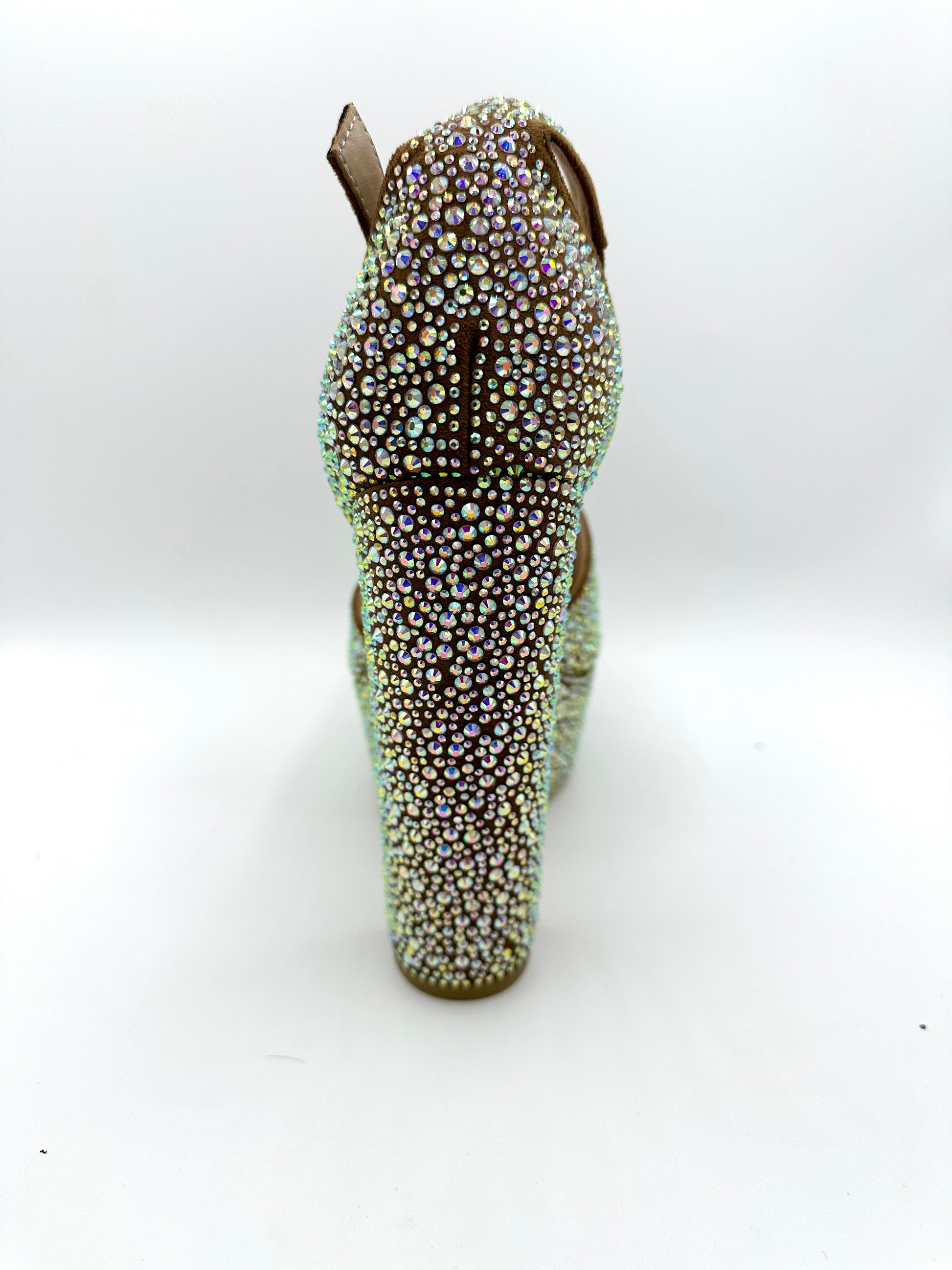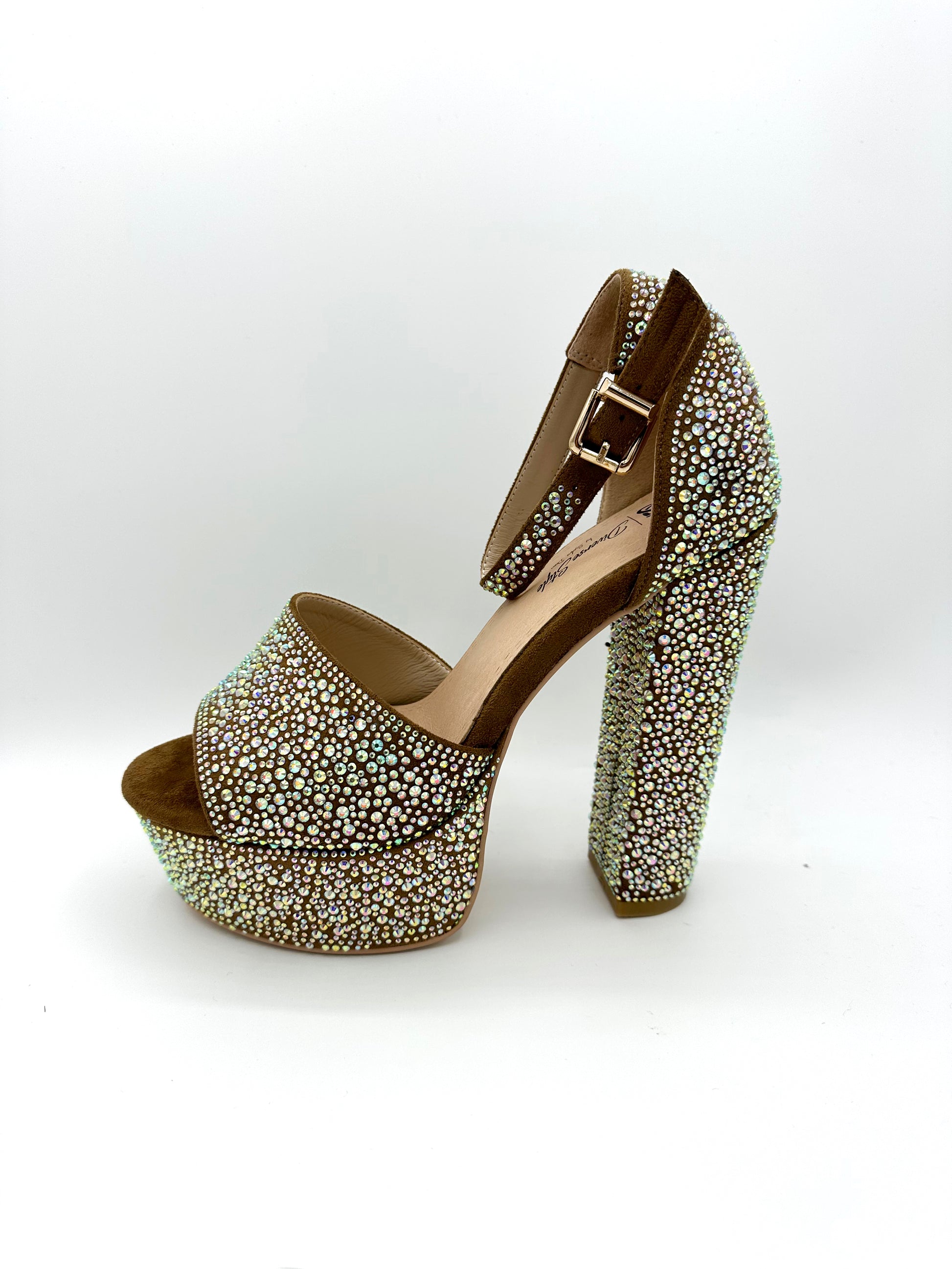 Made of suede material with individual stones placed all over. Wide heel with 1 1/2 inch platform, shoe is 6 1/2 inch in height, cushioned to feel like walking on pillows - True to size