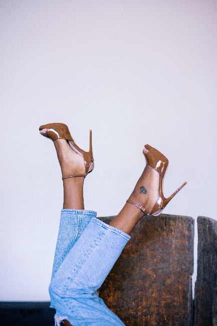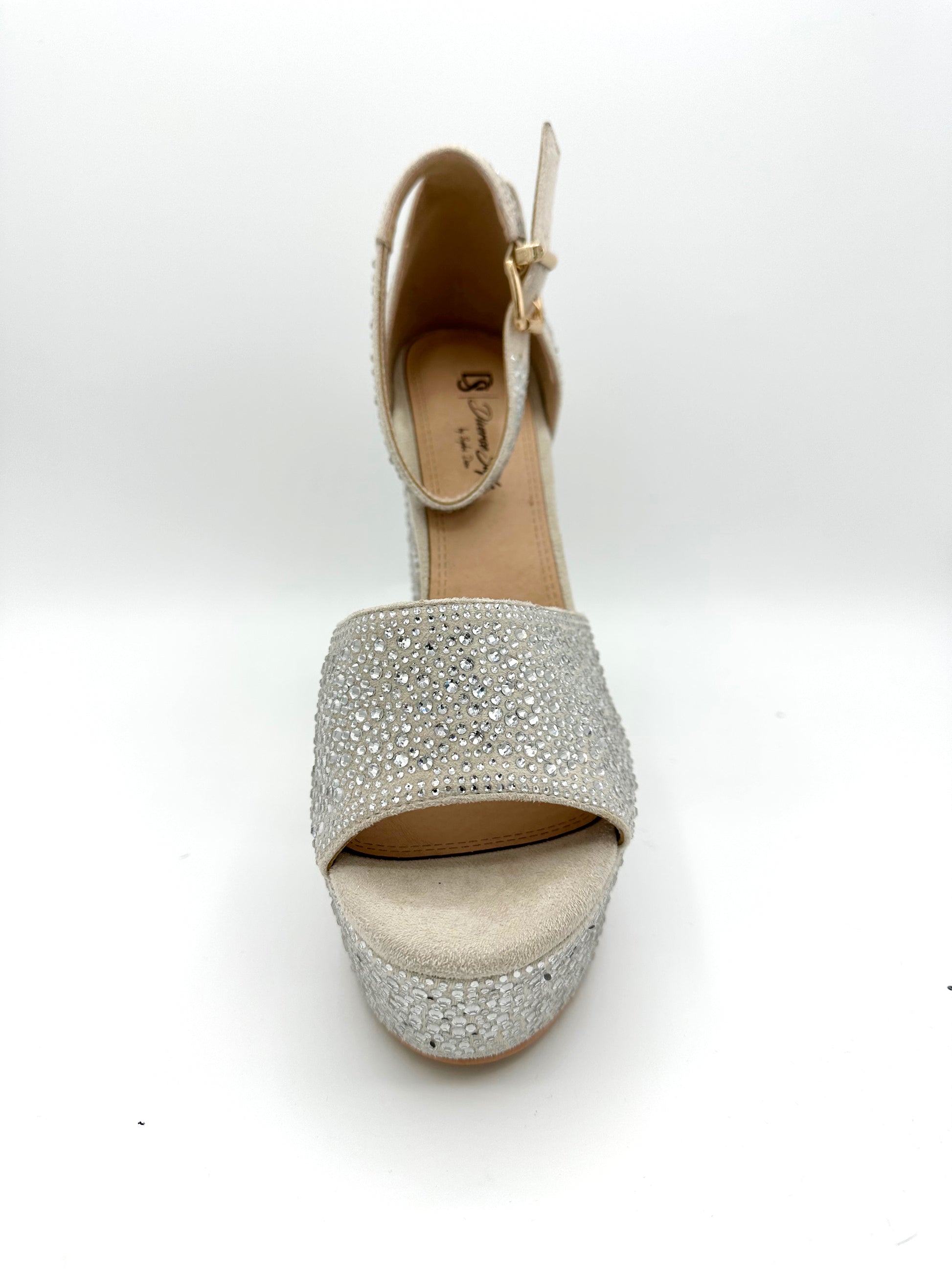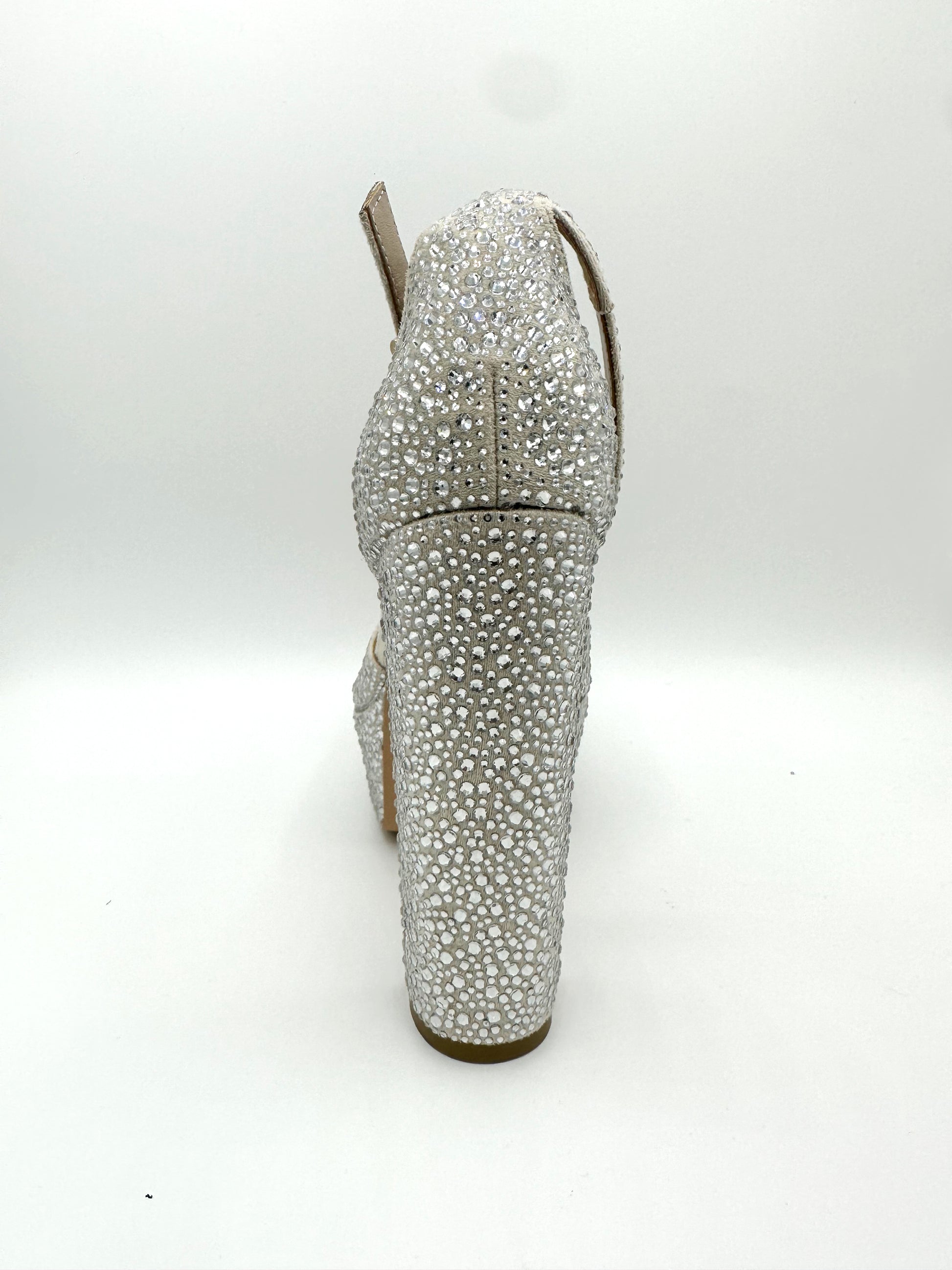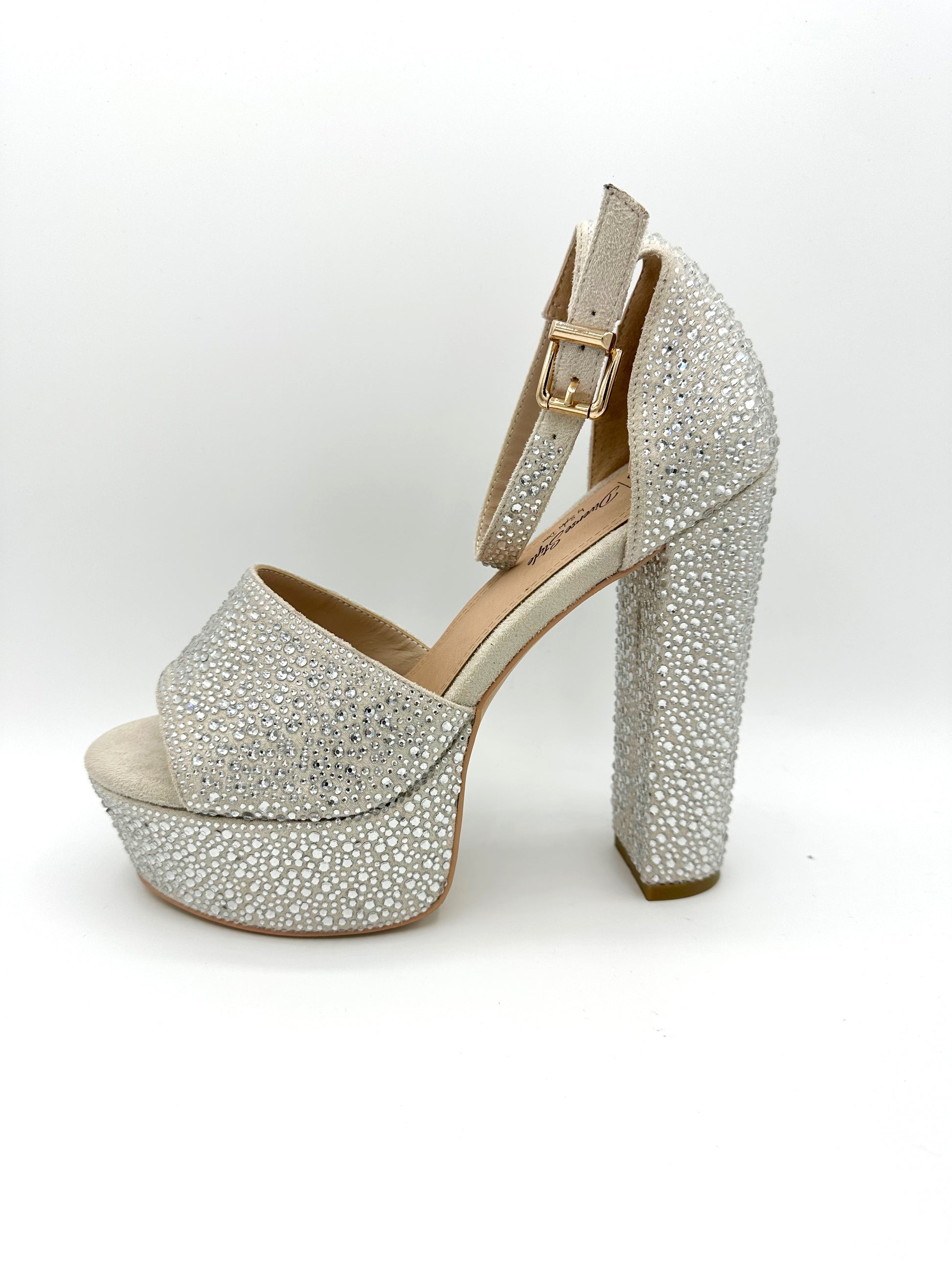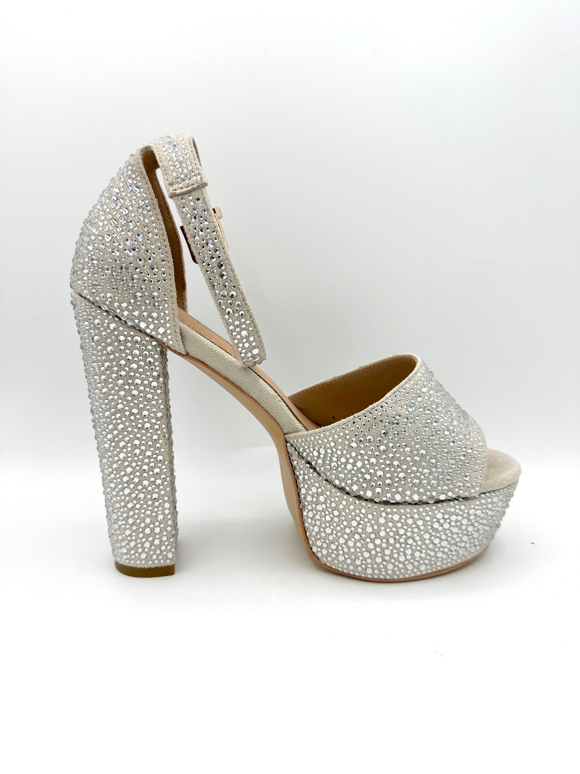 Made of suede material with individual stones placed all over. Wide heel with 1 1/2 inch platform, shoe is 6 1/2 inch in height, cushioned to feel like walking on pillows - True to size