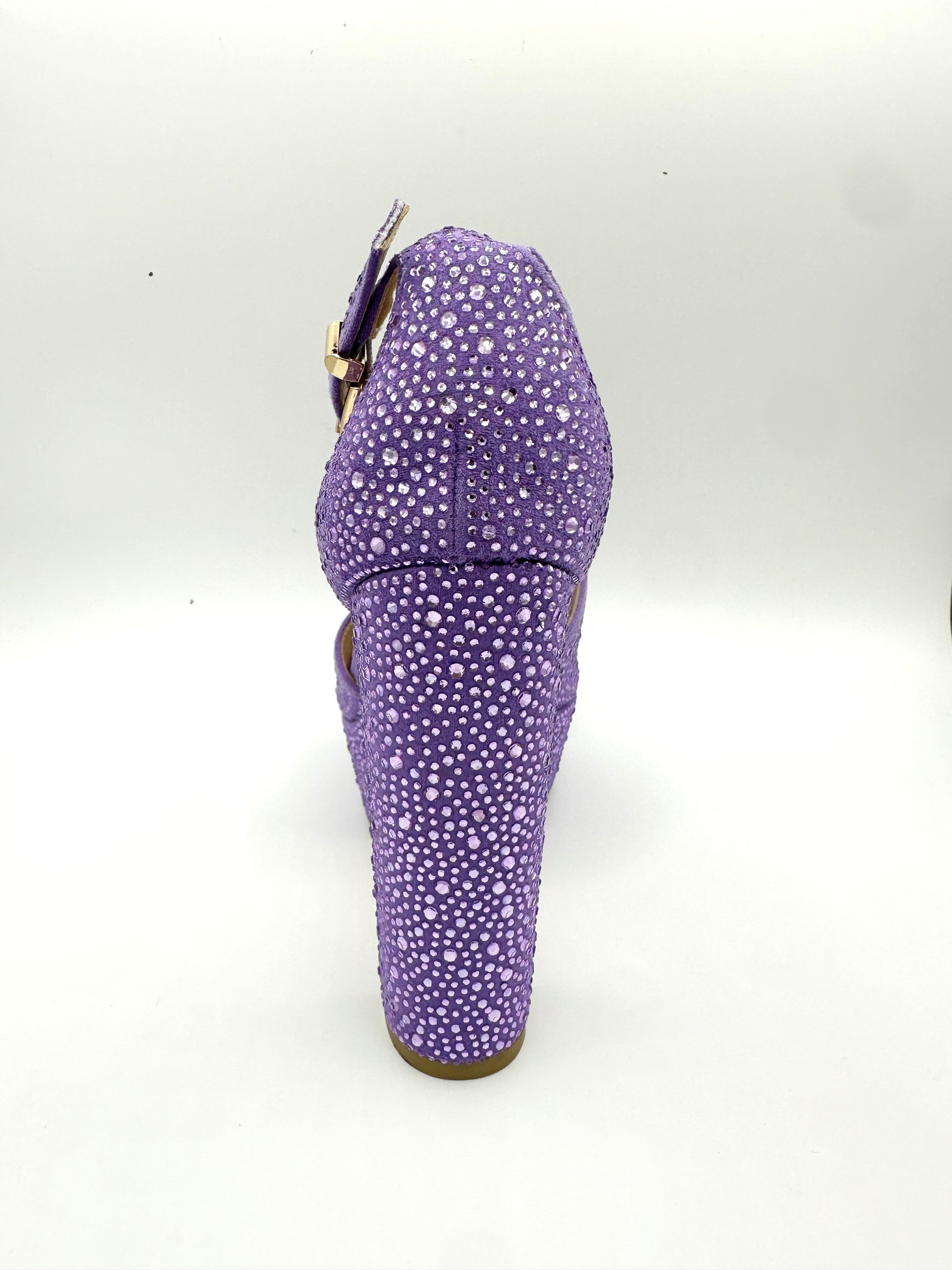 Made of suede material with individual stones placed all over. Wide heel with 1 1/2 inch platform, shoe is 6 1/2 inch in height, cushioned to feel like walking on pillows - True to size