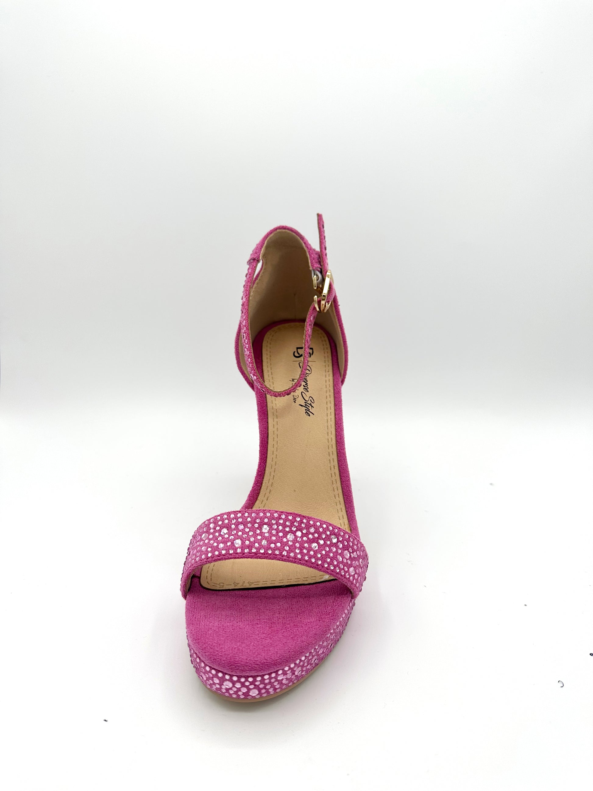 Made of suede material with individual stones placed all over. 4 1/2 inch in height with a wide heel, gold faux buckle on ankle strap - extra cushion for comfort to endure hours of standing- True to size